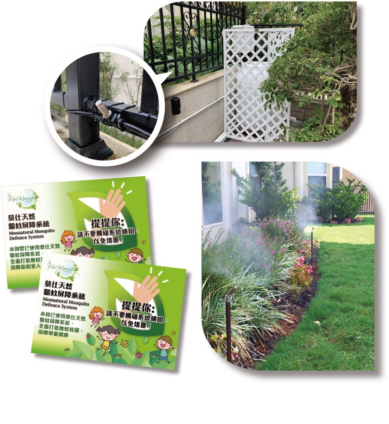 系統核心為專利註冊之BugDefenceTM100%純天然蚊蟲驅趕劑。共專利配方主要成份Geraniol香葉醇由多種純天然精華油提煉組合而成。配方中更含有Cedarwood Oil雪松油,是一種芳香撫人的專業天然蚊蟲驅趕劑。可聯繫我們!